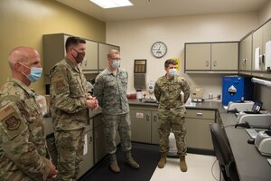Lt. Gen. Gene Kirkland, Air Force Sustainment Center commander, center, and Chief Master Sgt. David Flosi, AFSC command chief, visited the 72nd Medical Group's (MDG) clinic at Tinker Air Force Base, Oklahoma, Aug. 5, 2020. The visit allowed Kirkland and Flosi to gain a better understanding of how